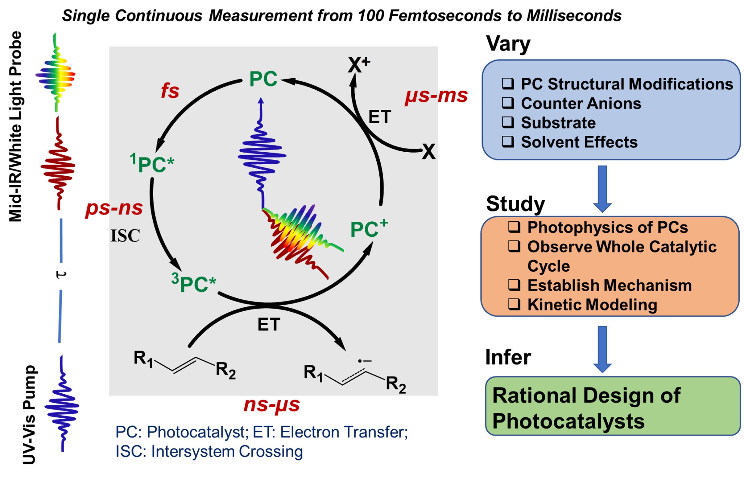 Photoredox catalysis has changed the landscape of synthetic chemistry research in the last decade. However, the mechanistic studies on these reactions have been limited. Our lab focuses on establishing the kinetic and mechanistic underpinnings of photoredox and photosensitized chemical reactions using spectroscopic and computational tools. We use time resolved infrared and transient absorption spectroscopy spanning both ultrafast (fs) and slow (ns to ms) timescales to directly observe transient species in each reaction step. Through data analysis and kinetic modeling, we are able to quantify not just the photophysical characterstics of catalysts, but the rate limiting steps, reaction bottle necks. Moreover, how changing reaction parameters such as structural changes to the photocatalyst, addition of other reagents, and solvent environment change the outcomes of each reaction step enable us to build a strong structure-function correlation to aid optimized Photocatalyst and catalytical cycle design for the desired reaction outcome. We are currently investigating multiple classes of photoredox chemistry including photoinduced electron vs energy transfer pathways, spectroelectrochemical investigation of consecutive photoinduced electron transfer chemistry, donor-acceptor photoredox chemistry. Stay tuned for exciting results soon.